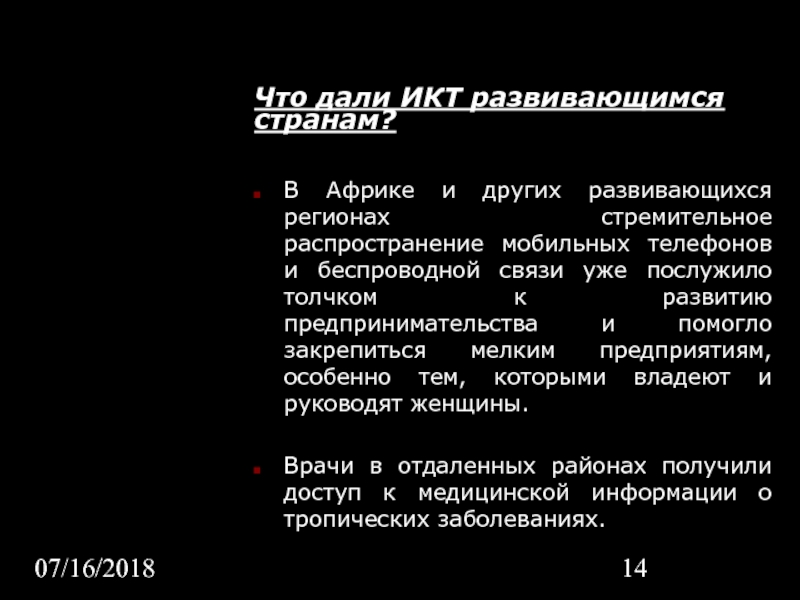 стремительное распространение мобильных телефонов и беспроводной связи уже послужило толчком к развитию предпринимательства и помогло закрепиться мелким предприятиям, особенно тем, которыми владеют и руководят женщины.