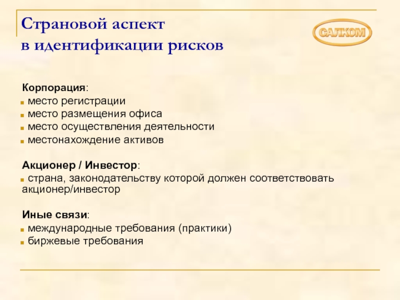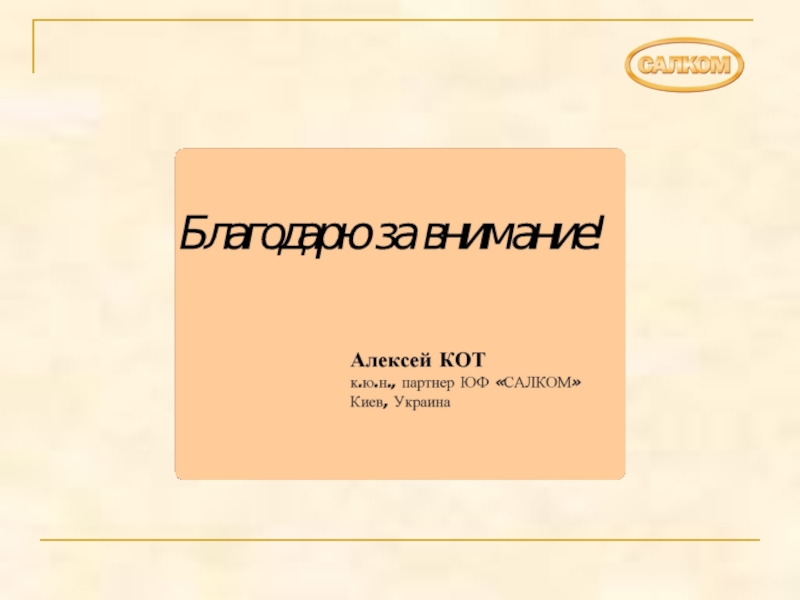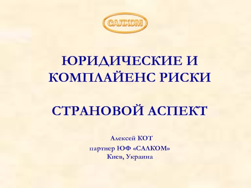 Слайд 1ЮРИДИЧЕСКИЕ И КОМПЛАЙЕНС РИСКИ СТРАНОВОЙ АСПЕКТ Алексей КОТ партнер ЮФ «САЛКОМ» Киев, Украина