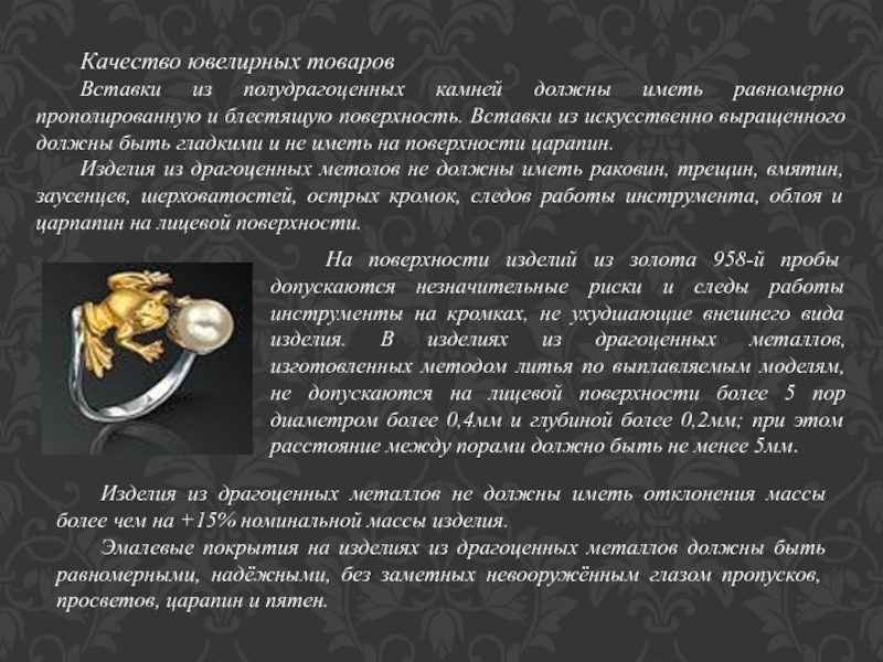 На поверхности изделий из золота 958-й пробы допускаются незначительные риски и следы работы инструменты на кромках, не ухудшающие внешнего вида изделия. В изделиях из драгоценных металлов, изготовленных методом литья по выплавляемым моделям, не допускаются на лицевой поверхности более 5 пор диаметром более 0,4мм и глубиной более 0,2мм; при этом расстояние между порами должно быть не менее 5мм.