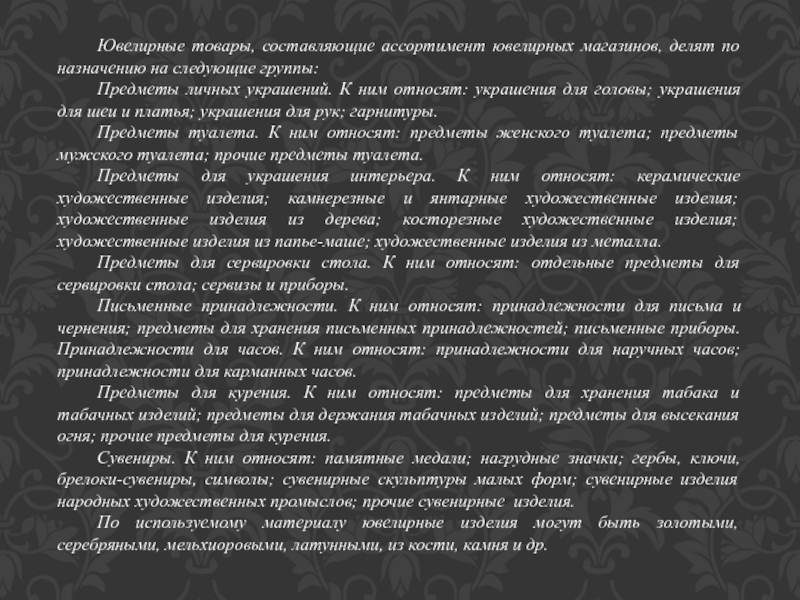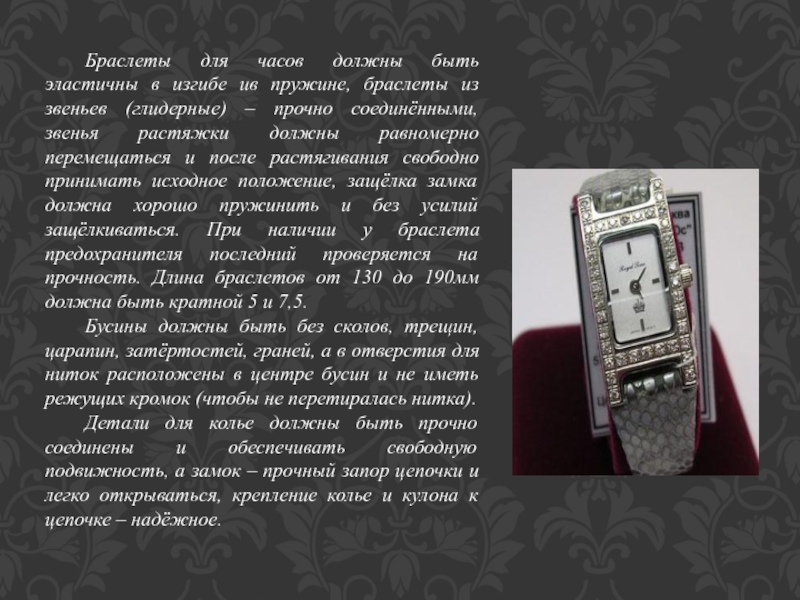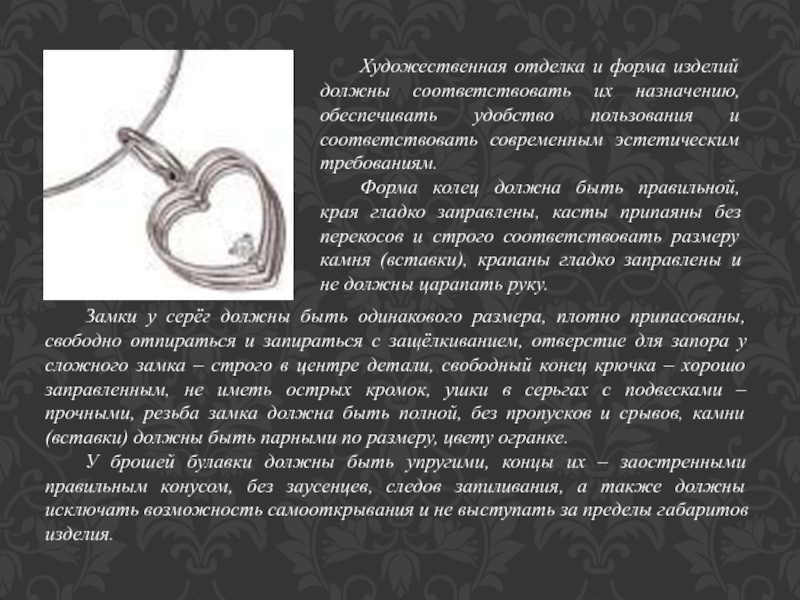 У цепочек все детали должны быть прочно соединены между собой, звенья цепочки - подвижные, цепочка должна обладать максимальной гибкостью, текучестью и при отвесе иметь строго вертикальное направление, без угловатостей. Замок цепочки при нажиме должен свободно открываться и закрываться, а запор – хорошо пружинить.