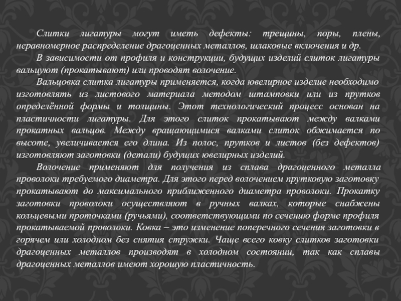 В зависимости от вида драгоценного металла и пробы будущего изделия составляют лигатуру, т. е. определяют необходимое количество драгоценного металла в сплаве и лигатурные металлы. Для золота лигатурными материалами являются в основном серебро и медь.