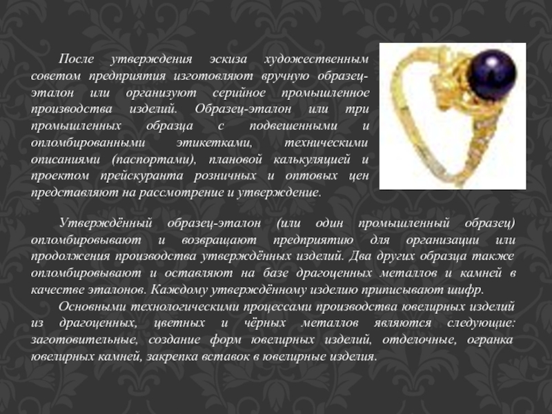 Утверждённый образец-эталон (или один промышленный образец) опломбировывают и возвращают предприятию для организации или продолжения производства утверждённых изделий. Два других образца также опломбировывают и оставляют на базе драгоценных металлов и камней в качестве эталонов. Каждому утверждённому изделию приписывают шифр.