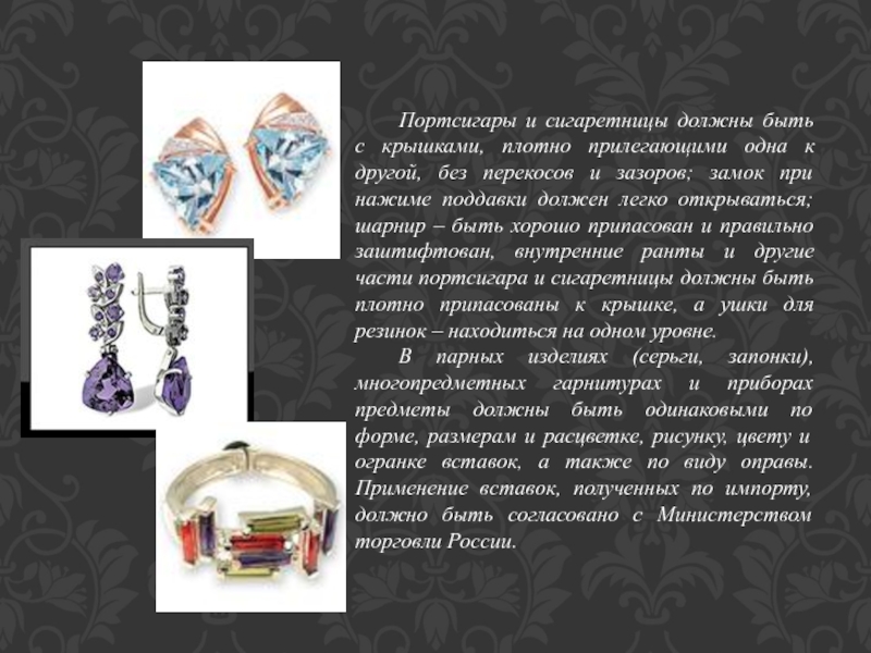 Форма колец должна быть правильной, края гладко заправлены, касты припаяны без перекосов и строго соответствовать размеру камня (вставки), крапаны гладко заправлены и не должны царапать руку.