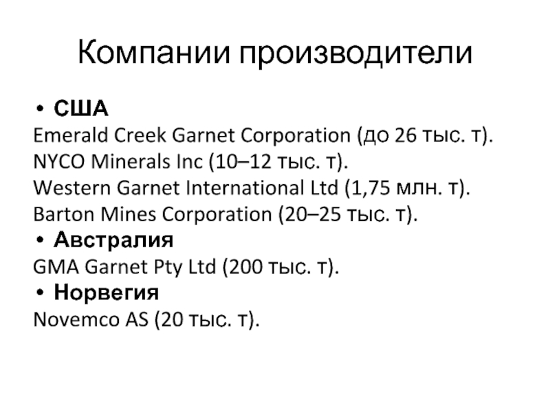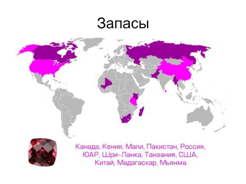 Объем запасов граната в России составляют 4 300 тыс. тонн (Карелия, Якутия, Чукотка).