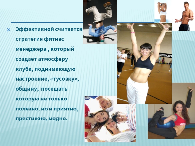 Эффективной считается стратегия фитнес менеджера , который создает атмосферу клуба, поднимающую