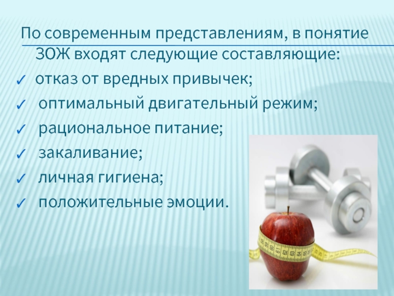 Слайд 3По современным представлениям, в понятие ЗОЖ входят следующие составляющие: