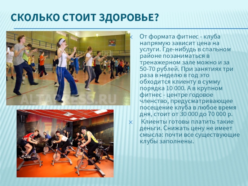 услуги. Где-нибудь в спальном районе позаниматься в тренажерном зале можно и за 50-70 рублей. При занятиях три раза в неделю в год это обходится клиенту в сумму порядка 10 000. А в крупном фитнес - центре годовое членство, предусматривающее посещение клуба в любое время дня, стоит от 30 000 до 70 000 р.