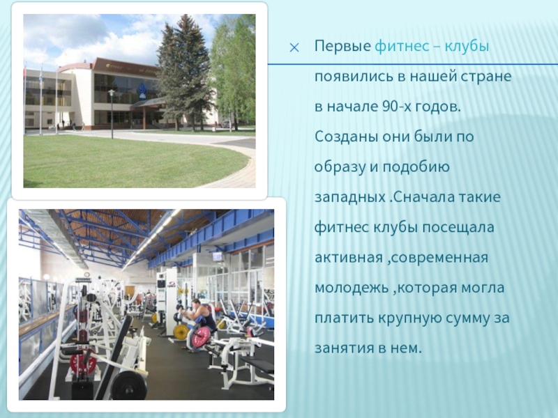 Слайд 6Первые фитнес – клубы появились в нашей стране в начале 90-х