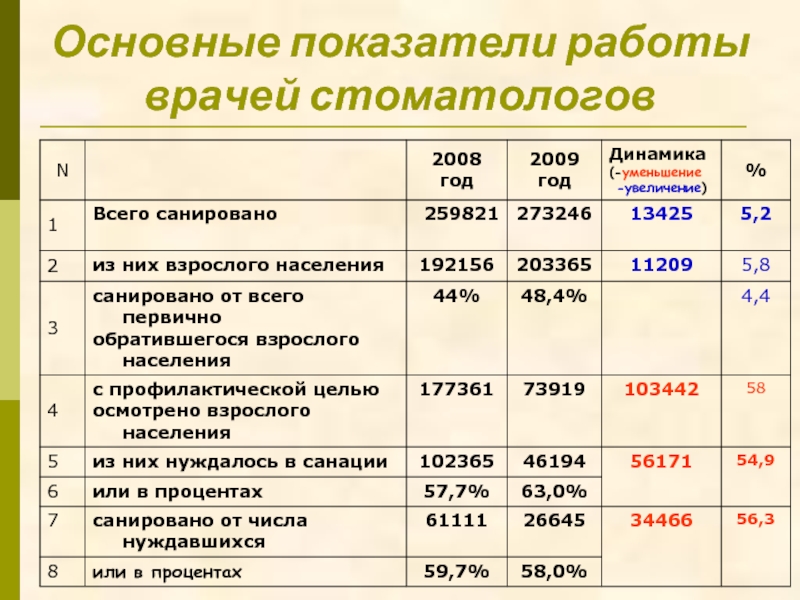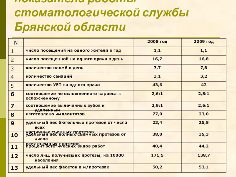 Слайд 34Основные качественные показатели работы стоматологической службы Брянской области