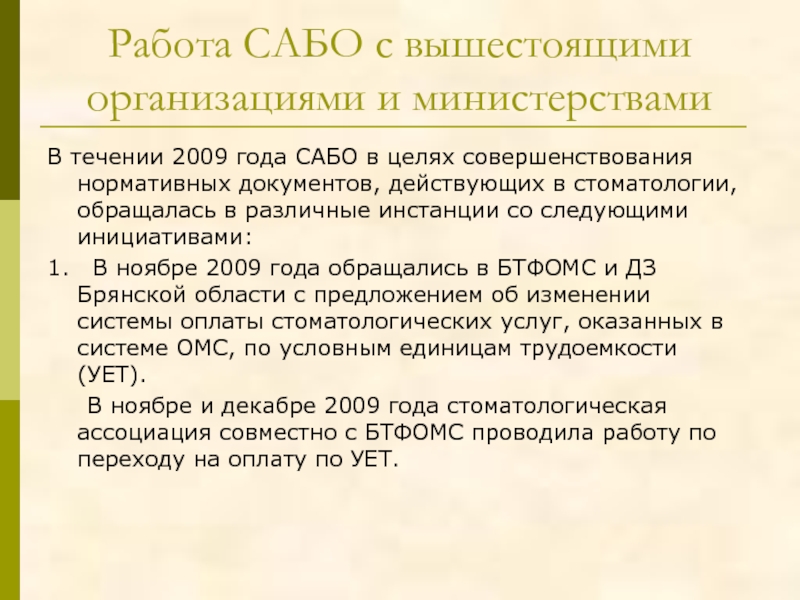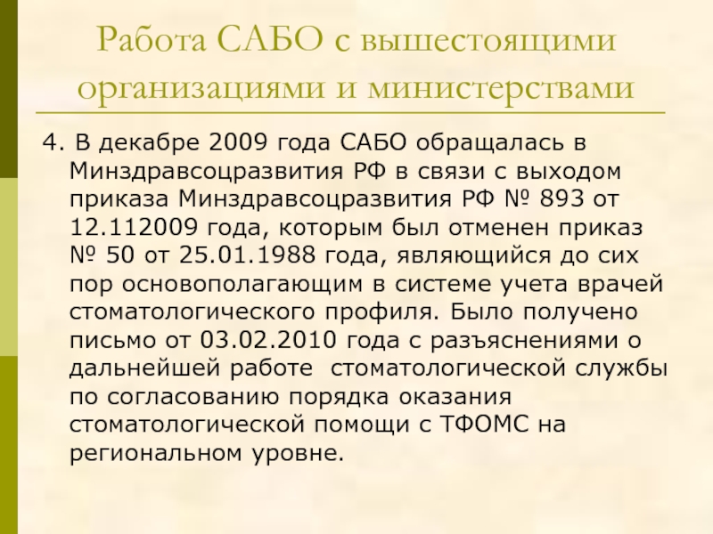 САБО обращалась в Минздравсоцразвития РФ в связи с выходом приказа Минздравсоцразвития РФ № 893 от 12.112009 года, которым был отменен приказ № 50 от 25.01.1988 года, являющийся до сих пор основополагающим в системе учета врачей стоматологического профиля. Было получено письмо от 03.02.2010 года с разъяснениями о дальнейшей работе стоматологической службы по согласованию порядка оказания стоматологической помощи с ТФОМС на региональном уровне.