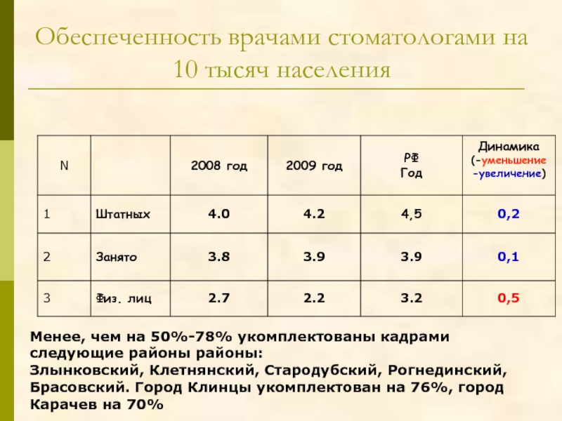 Слайд 8Обеспеченность врачами стоматологами на 10 тысяч населения