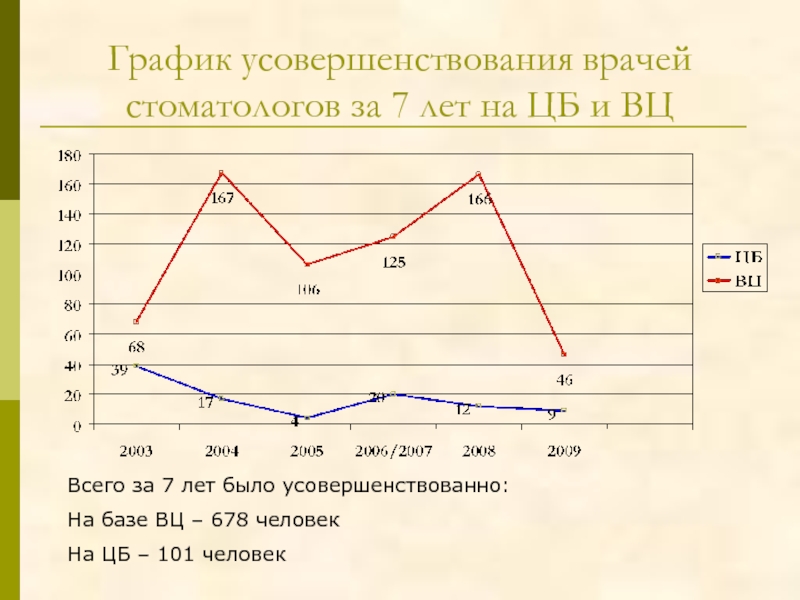 Слайд 13График усовершенствования врачей стоматологов за 7 лет на ЦБ и ВЦ