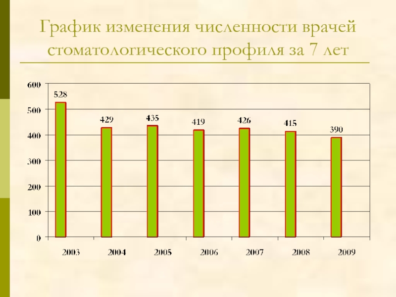 Слайд 7График изменения численности врачей стоматологического профиля за 7 лет