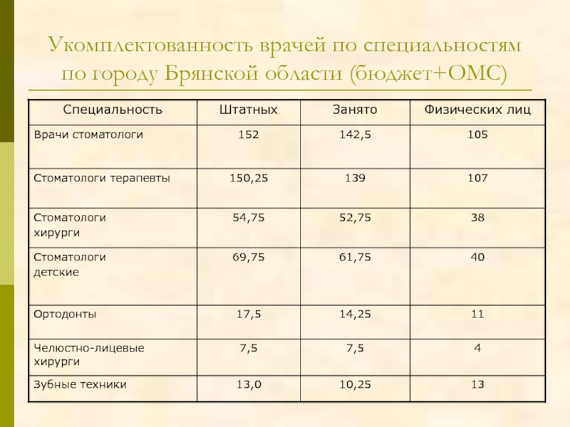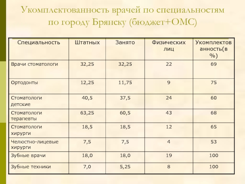 Слайд 6Укомплектованность врачей по специальностям по городу Брянской области (бюджет+ОМС)