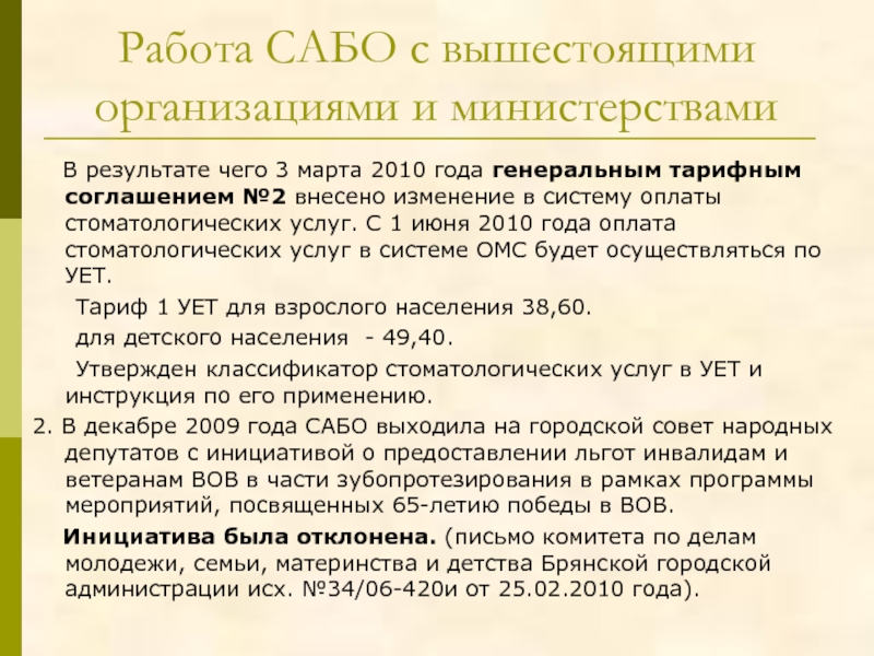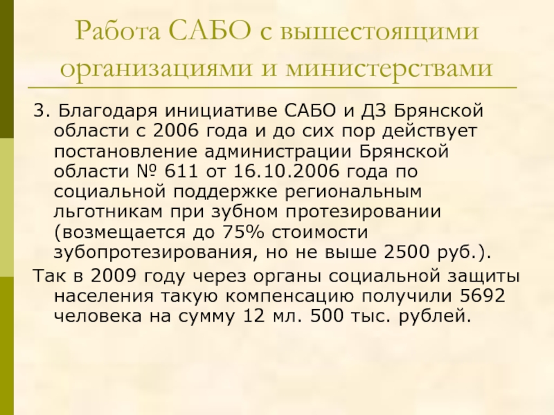 2. В декабре 2009 года САБО выходила на городской совет народных депутатов с инициативой о предоставлении льгот инвалидам и ветеранам ВОВ в части зубопротезирования в рамках программы мероприятий, посвященных 65-летию победы в ВОВ.