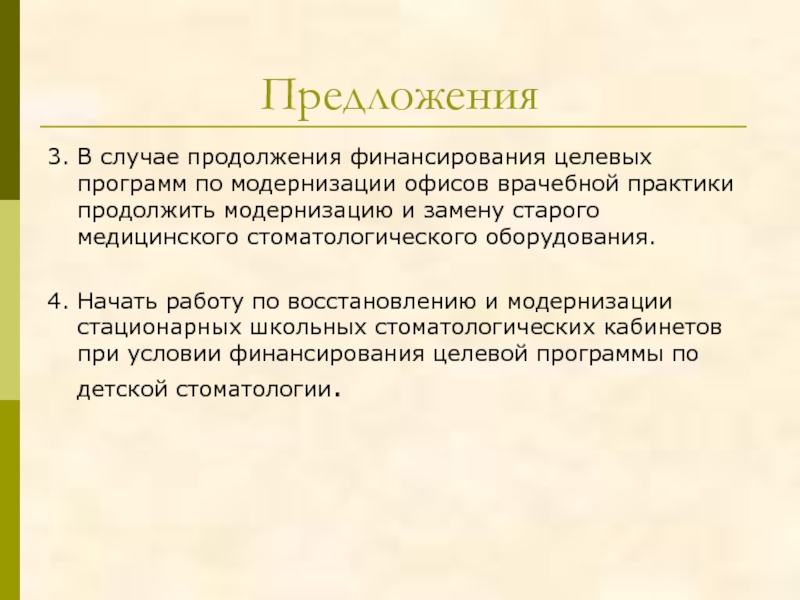 4. Начать работу по восстановлению и модернизации стационарных школьных стоматологических кабинетов при условии финансирования целевой программы по детской стоматологии.