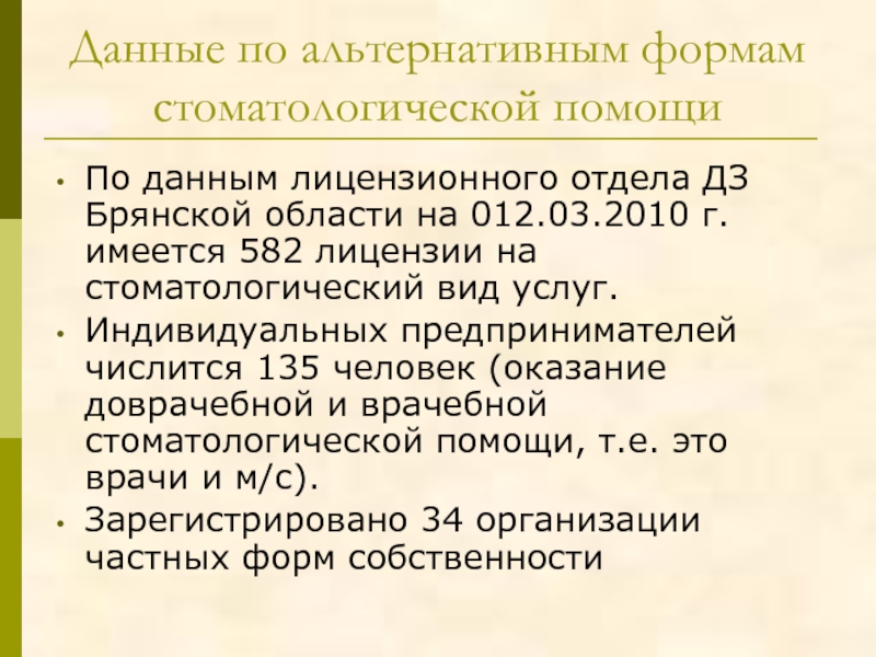 Слайд 10Данные по альтернативным формам стоматологической помощи