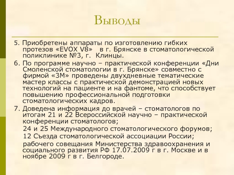 7. Доведена информация до врачей – стоматологов по итогам 21 и 22 Всероссийской научно – практической конференции стоматологов;