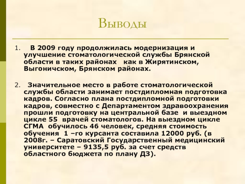1. В 2009 году продолжилась модернизация и улучшение стоматологической службы