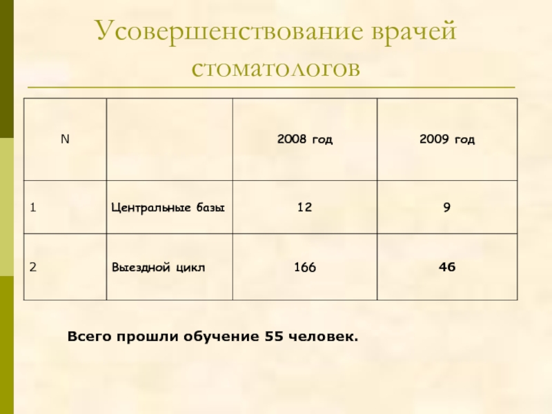 2. Значительное место в работе стоматологической службы области занимает постдипломная подготовка кадров. Согласно плана постдипломной подготовки кадров, совместно с Департаментом здравоохранения прошли подготовку на центральной базе и выездном цикле 55 врачей стоматологов. На выездном цикле СГМА обучилось 46 человек, средняя стоимость обучения 1 –го курсанта составила 12000 руб. (в 2008г. – Саратовский Государственный медицинский университете – 9135,5 руб. за счет средств областного бюджета по плану ДЗ).