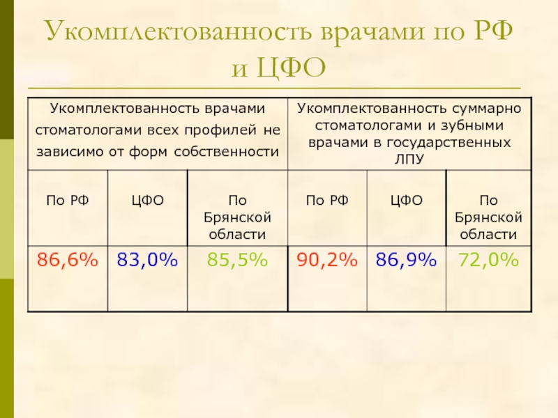 Слайд 11Укомплектованность врачами по РФ и ЦФО