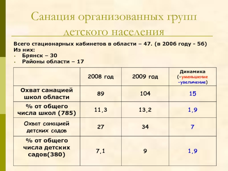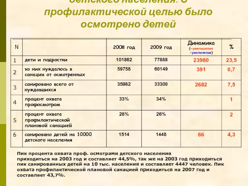 приходиться на 2003 год и составляет 44,5%, так же на 2003 год приходиться пик санированных детей на 10 тыс. населения и составляет 4447 человек. Пик охвата профилактической плановой санацией приходиться на 2007 год и составляет 43,7%.