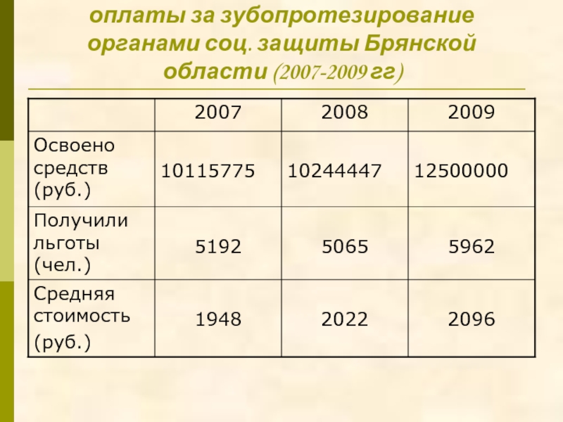 Слайд 33Динамика финансирования частичной оплаты за зубопротезирование органами соц. защиты Брянской области