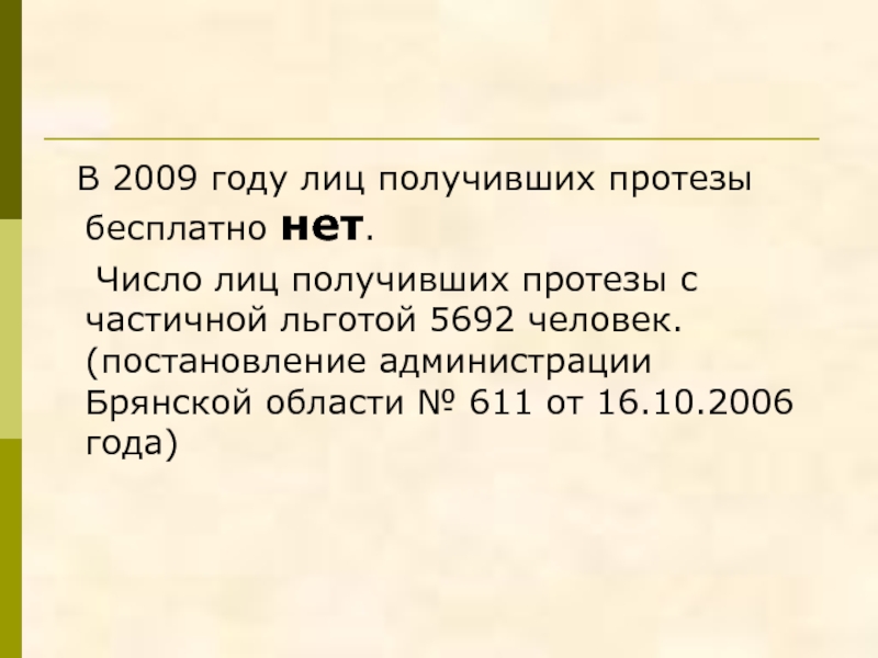 протезы с частичной льготой 5692 человек. (постановление администрации Брянской области № 611 от 16.10.2006 года)