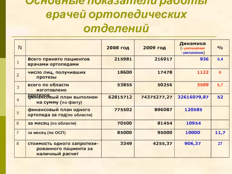 Слайд 31Основные показатели работы врачей ортопедических отделений