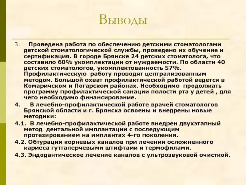 службы, проведено их обучение и сертификация. В городе Брянске 24 детских стоматолога, что составило 60% укомплектации от нуждаемости. По области 40 детских стоматологов, укомплектованность 57%. Профилактическую работу проводят централизованным методом. Большой охват профилактической работой ведется в Комаричском и Погарском районах. Необходимо продолжать программу профилактической санации полости рта у детей , для чего необходимо финансирование.