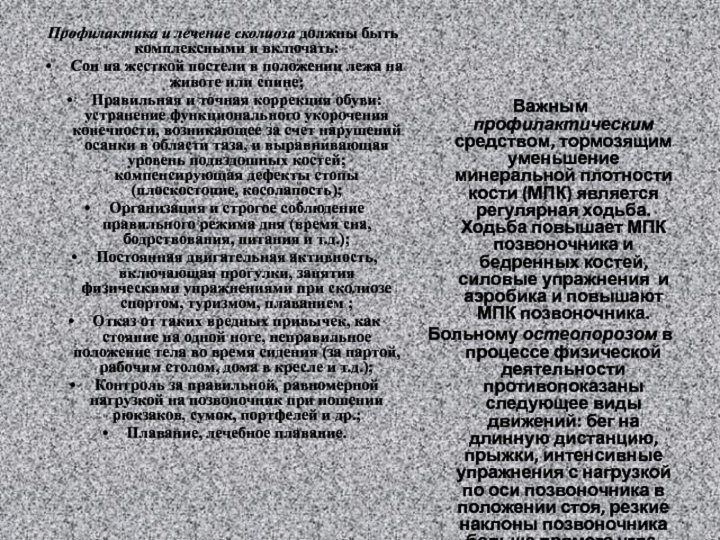 Важным профилактическим средством, тормозящим уменьшение минеральной плотности кости (МПК) является регулярная ходьба. Ходьба повышает МПК позвоночника и бедренных костей, силовые упражнения и аэробика и повышают МПК позвоночника.