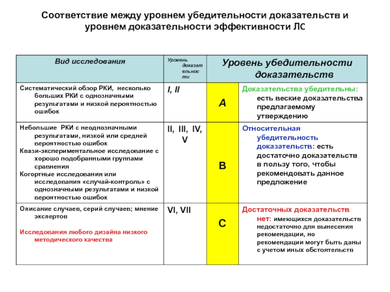 Слайд 15Соответствие между уровнем убедительности доказательств и уровнем доказательности эффективности ЛC