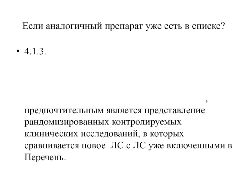 ЛС одной анатомо-терапевтической химической группы, одного терапевтического действия, одного химического строения по сравнению с препаратами уже включенными в Перечень, предпочтительным является представление рандомизированных контролируемых клинических исследований, в которых сравнивается новое ЛС с ЛС уже включенными в Перечень.
