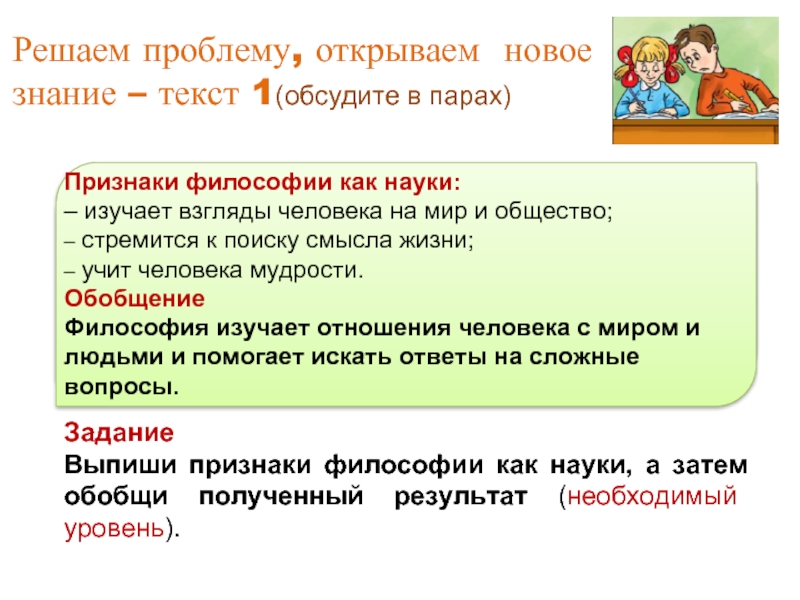 Выпиши признаки философии как науки, а затем обобщи полученный результат (необходимый уровень).
