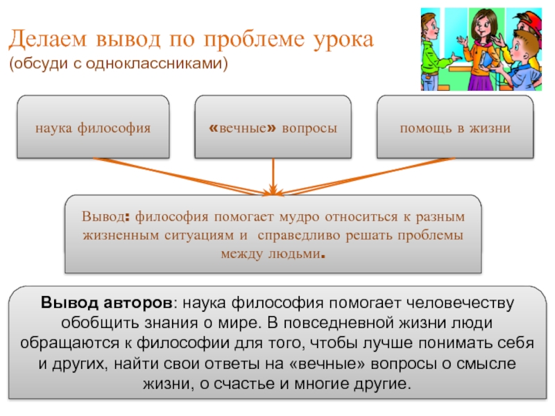 Вывод авторов: наука философия помогает человечеству обобщить знания о мире. В повседневной жизни люди обращаются к философии для того, чтобы лучше понимать себя и других, найти свои ответы на «вечные» вопросы о смысле жизни, о счастье и многие другие.