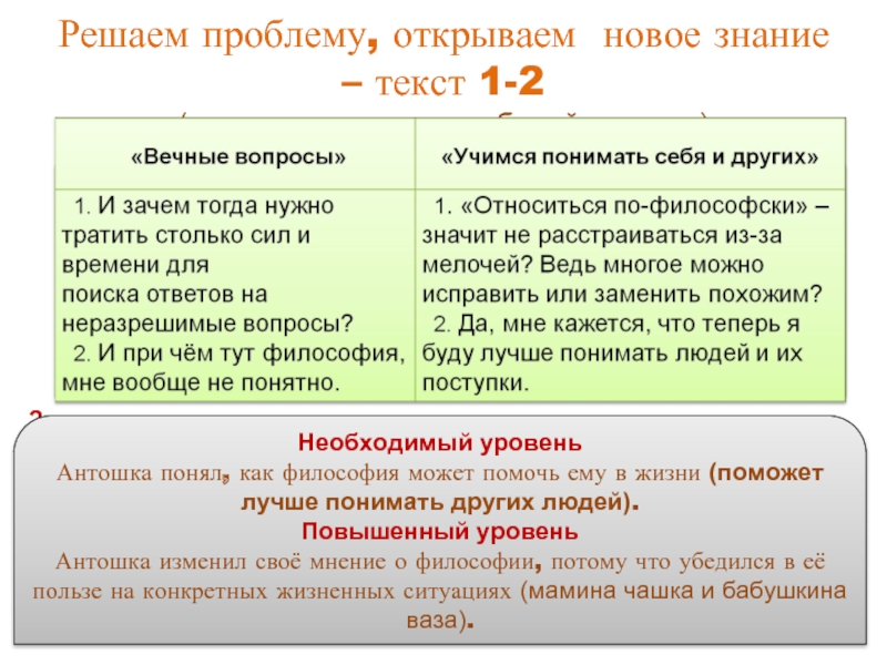 Выпиши из каждого текста по одной фразе, отражающей отношение Антошки к философии. Определи, в чём изменился его взгляд на философию (необходимый уровень)