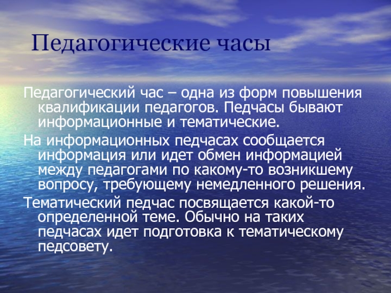 Тематический педчас посвящается какой-то определенной теме. Обычно на таких педчасах идет подготовка к тематическому педсовету.