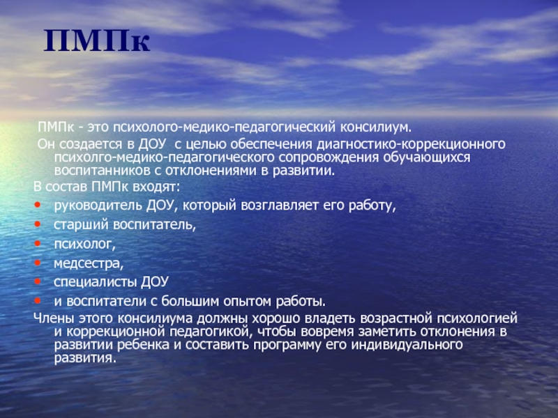 Члены этого консилиума должны хорошо владеть возрастной психологией и коррекционной педагогикой, чтобы вовремя заметить отклонения в развитии ребенка и составить программу его индивидуального развития.