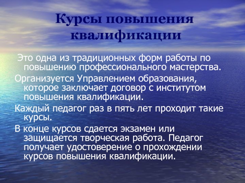 В конце курсов сдается экзамен или защищается творческая работа. Педагог получает удостоверение о прохождении курсов повышения квалификации.
