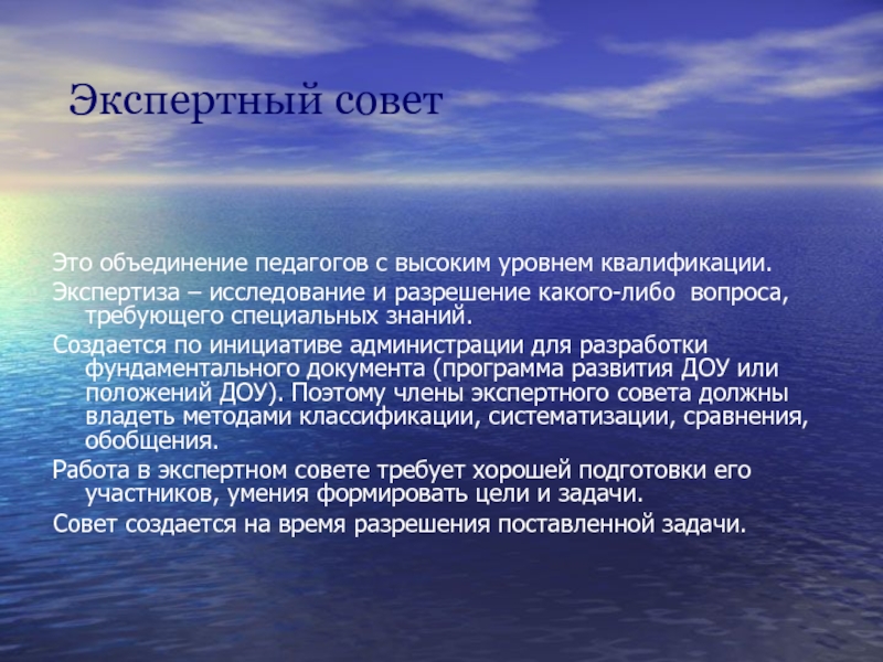 Создается по инициативе администрации для разработки фундаментального документа (программа развития ДОУ или положений ДОУ). Поэтому члены экспертного совета должны владеть методами классификации, систематизации, сравнения, обобщения.