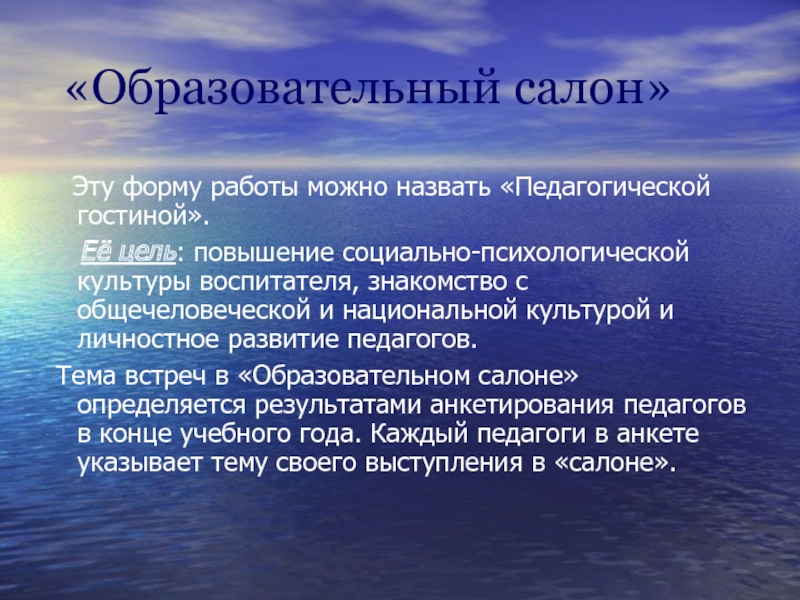 Тема встреч в «Образовательном салоне» определяется результатами анкетирования педагогов в конце учебного года. Каждый педагоги в анкете указывает тему своего выступления в «салоне».