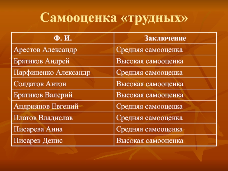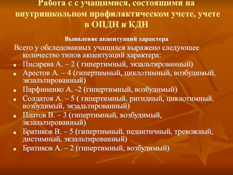 Братиков В. – 5 (гипертимный, педантичный, тревожный, дистимный, экзальтированный)
