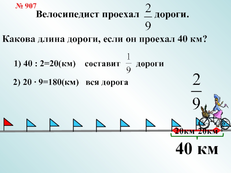 1) 4 : 2 = 2 (км) составит 1 доля дороги