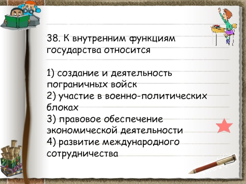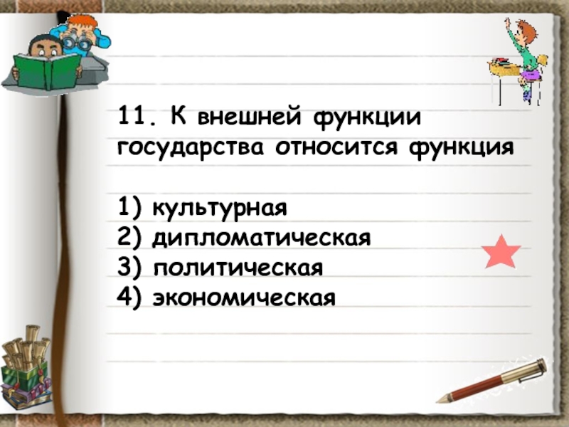 Слайд 1211. К внешней функции государства относится функция