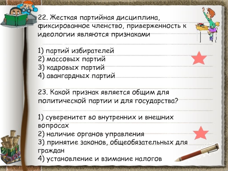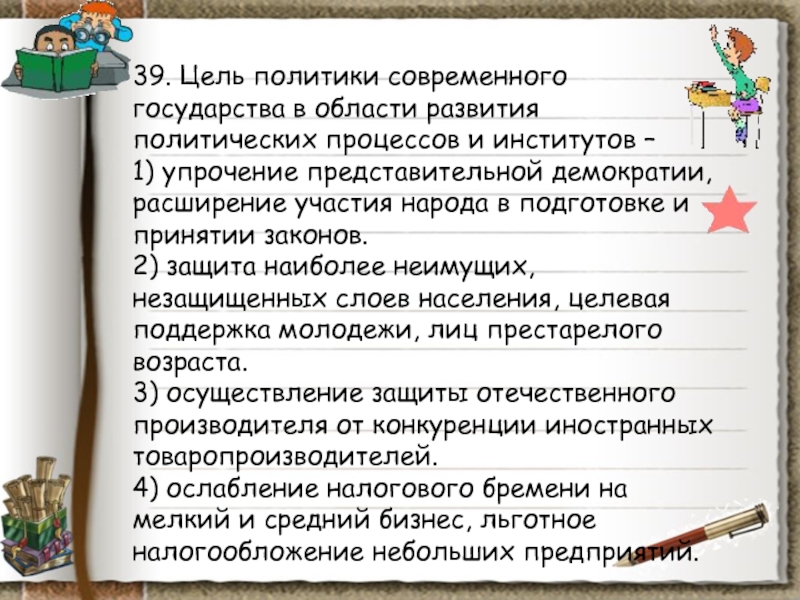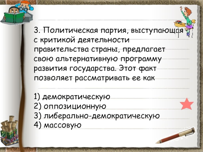 Слайд 10038. Какой из приведенных примеров характеризует деятельность правящей партии?