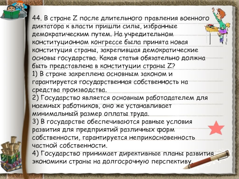 Слайд 10139. В стране М после длительного правления военного диктатора к власти