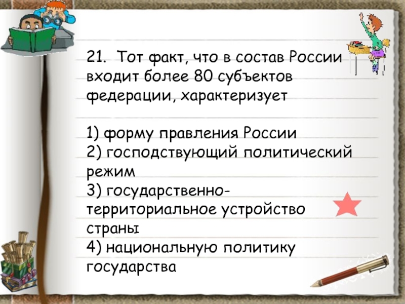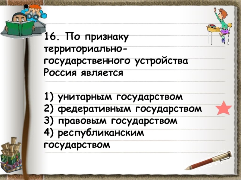 Слайд 1616. По признаку территориально-государственного устройства Россия является