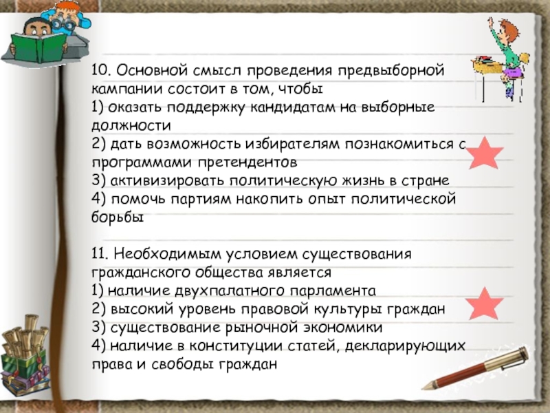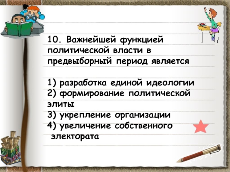 Слайд 1110. Важнейшей функцией политической власти в предвыборный период является