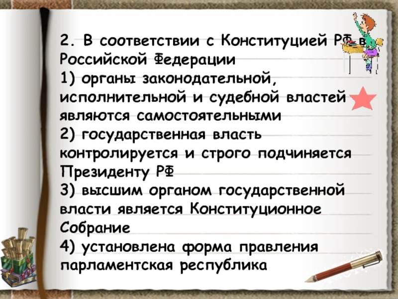 Слайд 1312. Одна из ветвей власти в демократическом государстве