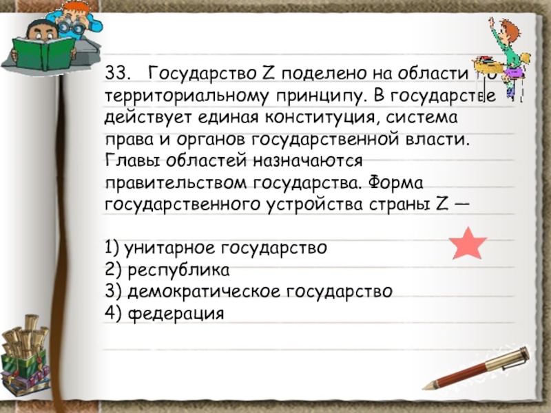 Слайд 9533. Государство Z поделено на области по территориальному принципу. В государстве